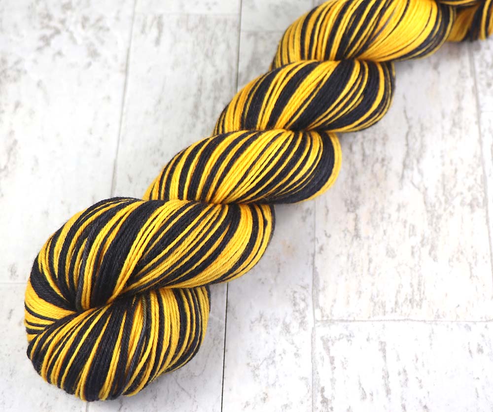 This is for a DYED TO ORDER listing of "BLACK - GOLD" self-striping colorway. Stripes will be between 1/2 - 3/4" depending on gauge for knitting socks.