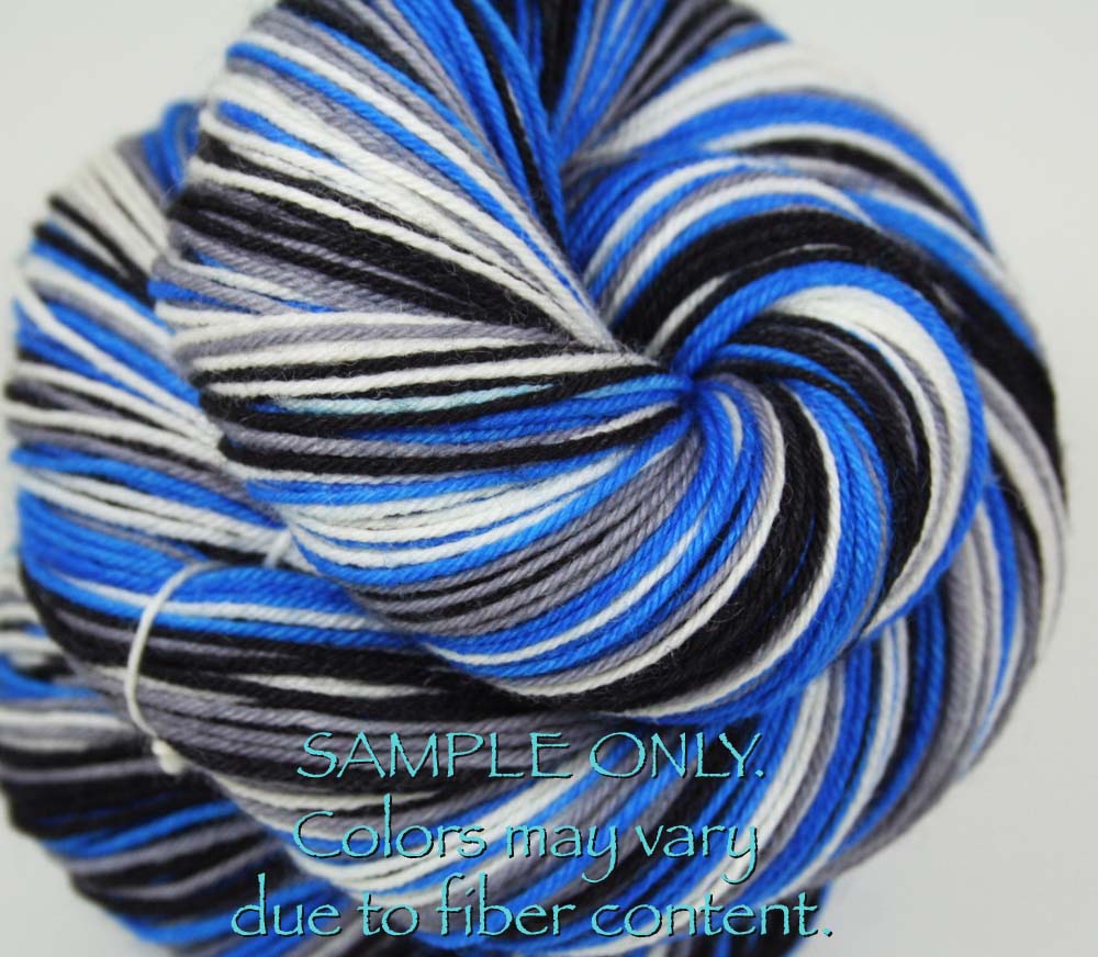 This is for a DYED TO ORDER listing of "BLUE - GRAY - BLACK - WHITE" self-striping colorway. Stripes will be between 1/2 - 3/4" depending on gauge for knitting socks.
