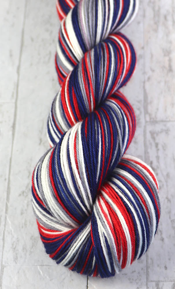 BLUE RED GRAY WHITE: SW Merino/Nylon - Hand-dyed Self-Stripe Sock Yarn - NEW ENGLAND, COLUMBUS