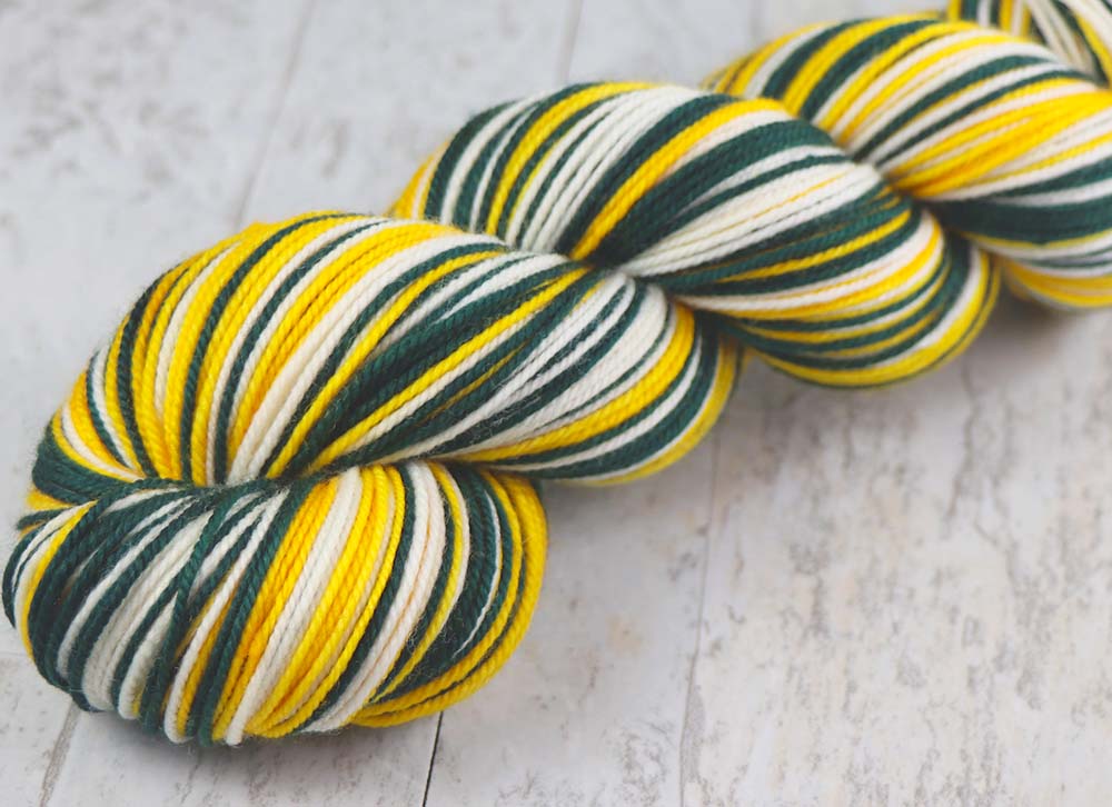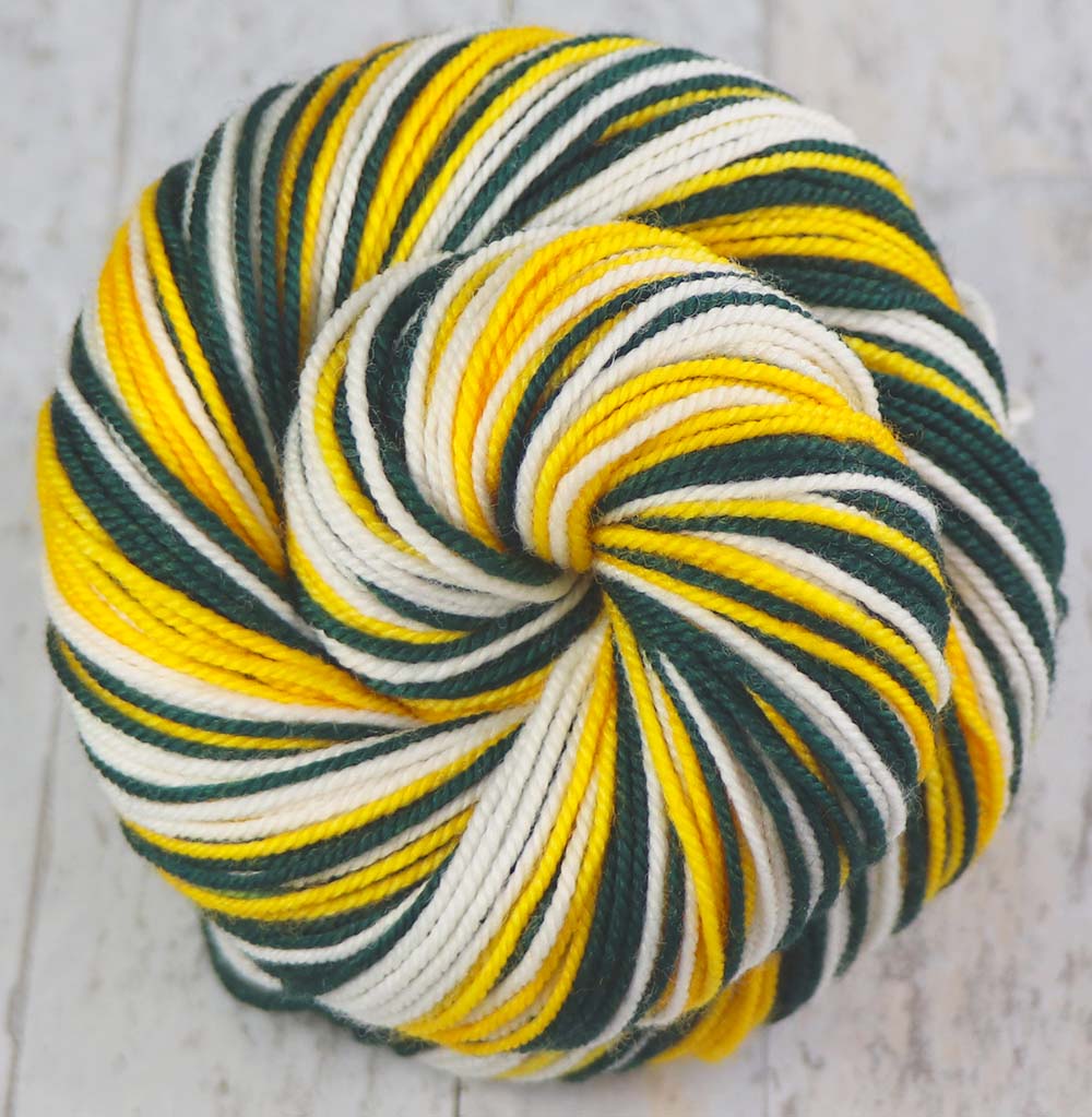 GREEN GOLD WHITE: SW Merino/Nylon - Self-striping Hand dyed Sport weight yarn - GREEN BAY, OAKLAND