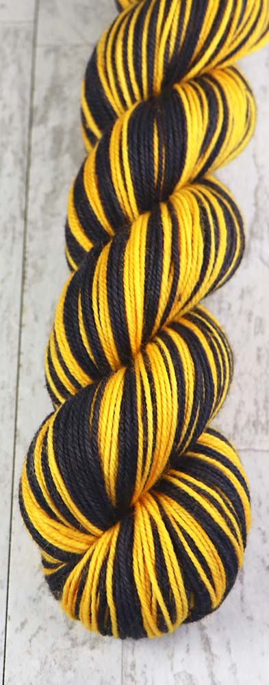 BLACK - GOLD80% Superwash Merino Wool, 20% Nylon sport weight yarn: "HALEIWA" base328 yards / 100 grams / 3-ply yarnhandwash in cool water, lay flat to dry In stock: 1 ~~ Self-striping yarn is perfect for the fan in your...