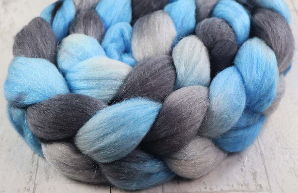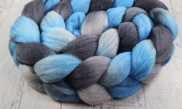 BLUE GRAY BLACK WHITERambouillet / Merino / Bright Nylon roving 4ozhandwash In stock: 1 ~~ Inspired by one of my self-striping yarn colorways, this colorway works for teams in Detroit and more! A beautiful blue pairs with gray, black and...