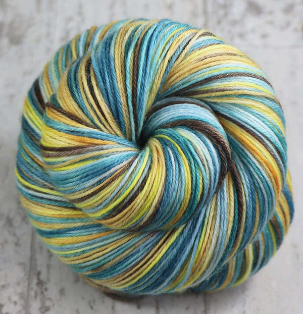 BUSAN BEAUTYColor: Blue, Light Blue, Yellow, Gold, Orange-Peach, Brown80% Superwash Merino wool / 10% Cashmere / 10% Nylon: "MAUI" base435 yards / 100 grams / 4-ply sock yarnhandwash in cool water, lay flat to dry In stock: 1 ~~ A...