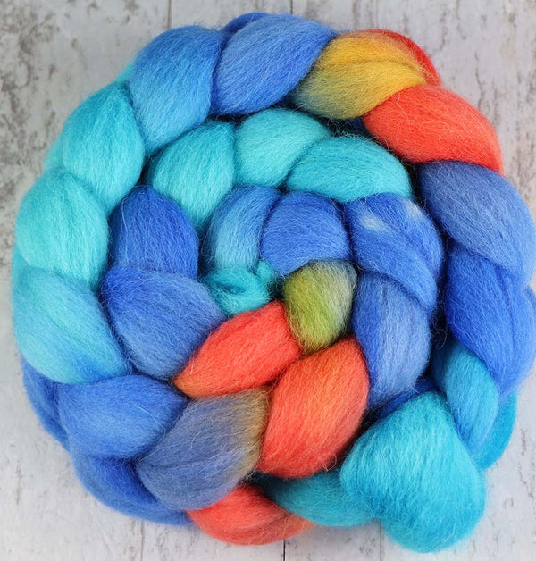 POOLSIDE SUNSETColors: Blues, Turquoise, Pinks, Orange, YellowKent Romney wool roving4.0 oz handwash In stock: 1 ~~ This inspirational photo was taken during a winter trip to Costa Rica! From morning to evening, the views were amazing and what better way to end the...