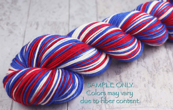This is for a DYED TO ORDER listing of "BLUE - RED - WHITE" self-striping colorway. Stripes will be between 1/2 - 3/4" depending on gauge for knitting socks (sock weight yarn). Colors: Blue, Red, WhiteAll yarns: handwash in cool...