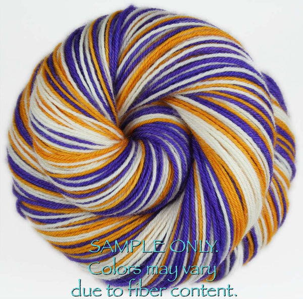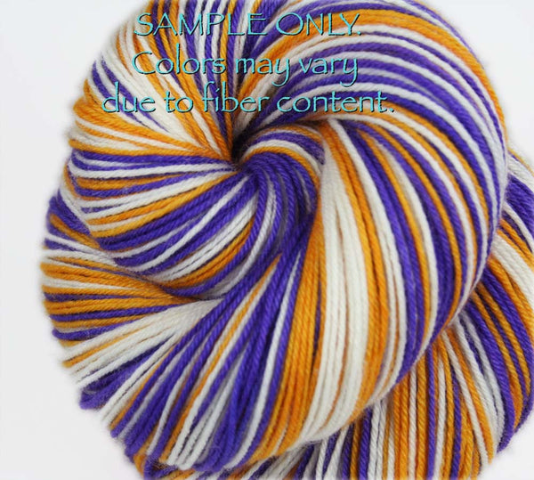 This is for a DYED TO ORDER listing of "PURPLE - GOLD -WHITE" self-striping colorway. Stripes will be between 1/2 - 3/4" depending on gauge for knitting socks. *Please use the drop-down menu to choose the YARN BASE. Colors: Purple,...