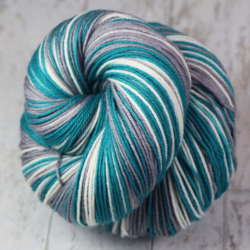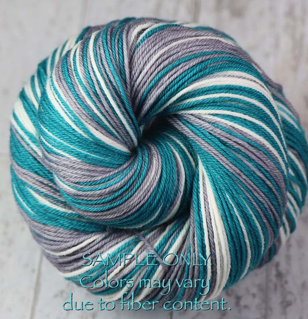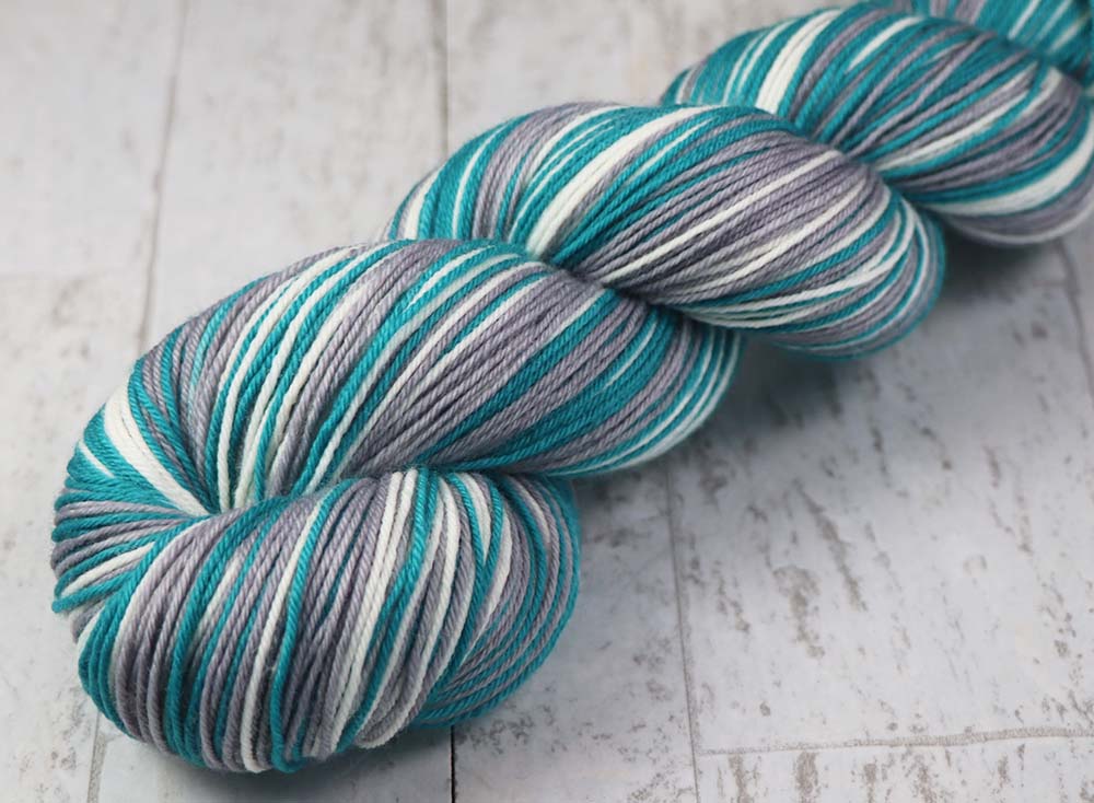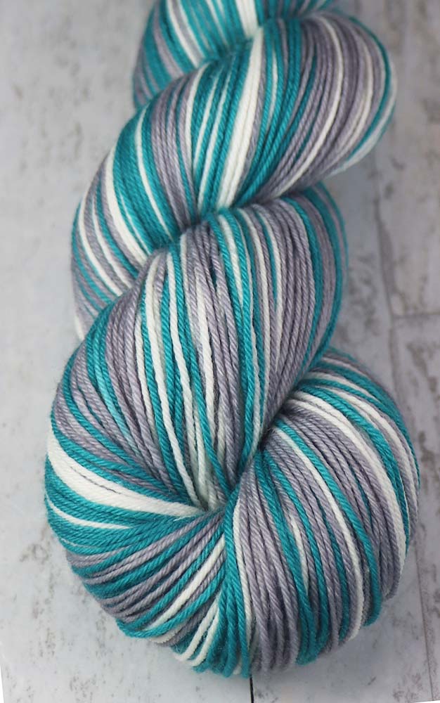 This is for a DYED TO ORDER listing of "TURQUOISE-GRAY-WHITE" self-striping colorway. Stripes will be between 1/2 - 3/4" depending on gauge for knitting socks.