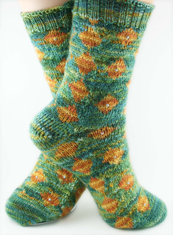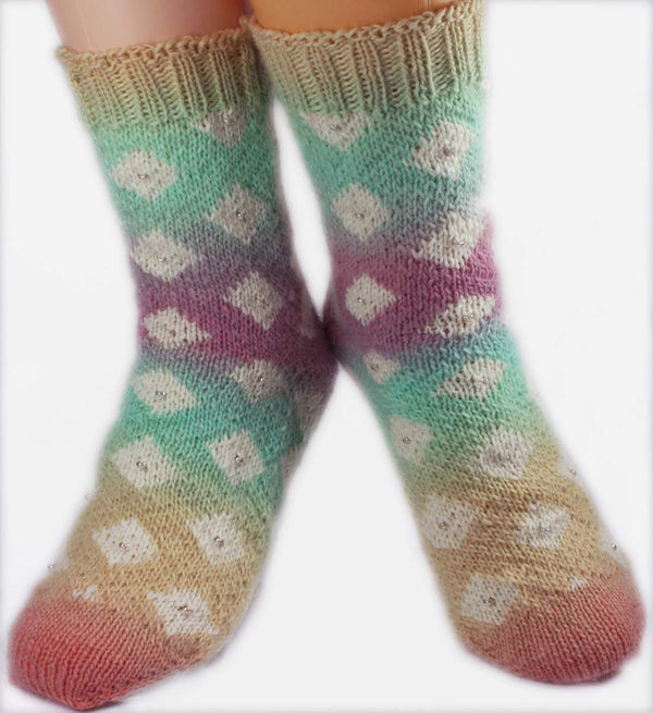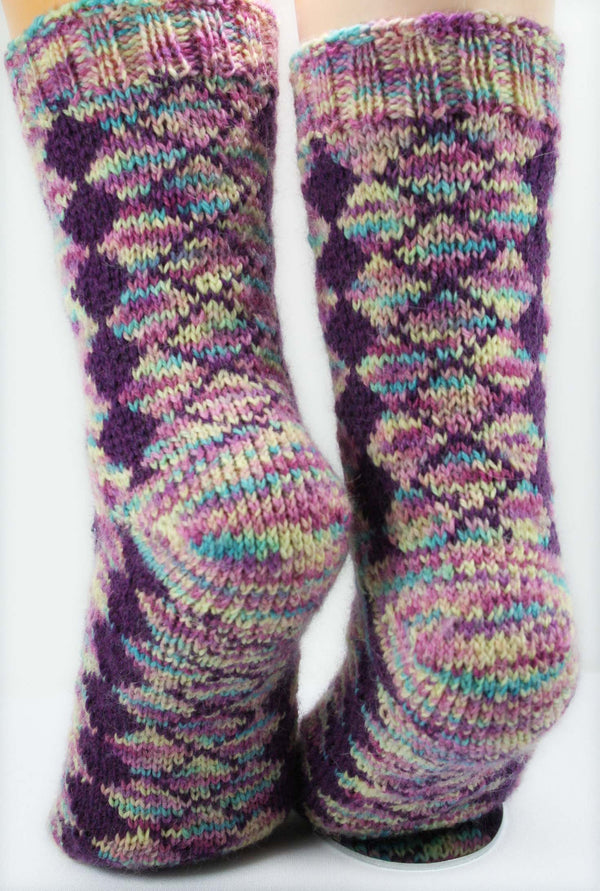 **NOTE: This is for the KNITTING PATTERN, not the socks themselves**This listing is for the Desiree Diamond Socks PATTERN which is a charted toe-up sock pattern using 2 different fingering weight yarns for Size Medium, knitted on two circular needles...