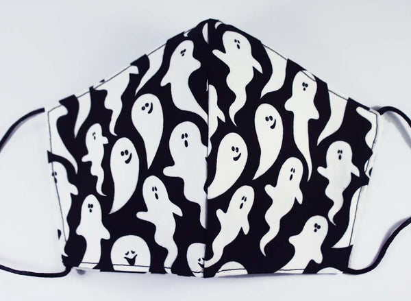 MASK: Ghosts (Glow in the Dark) #1 - Large Size: Large - Approximately 8.5 wide x 6 high (in inches @ widest/highest points) Materials: Cotton, Interfacing, Nylon cord, Rubber cord stopper In stock: 1_______ These masks are made with interfacing between the outer fabric...