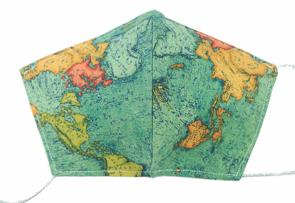 MASK: Teal World Map #7 - Medium Size: Medium - Approximately 7.75 wide x 5.5 high (in inches @ widest/highest points) Materials: Cotton, Interfacing, Nylon cord In stock: 1_______ These masks are made with interfacing between the outer fabric and lining. The nylon...