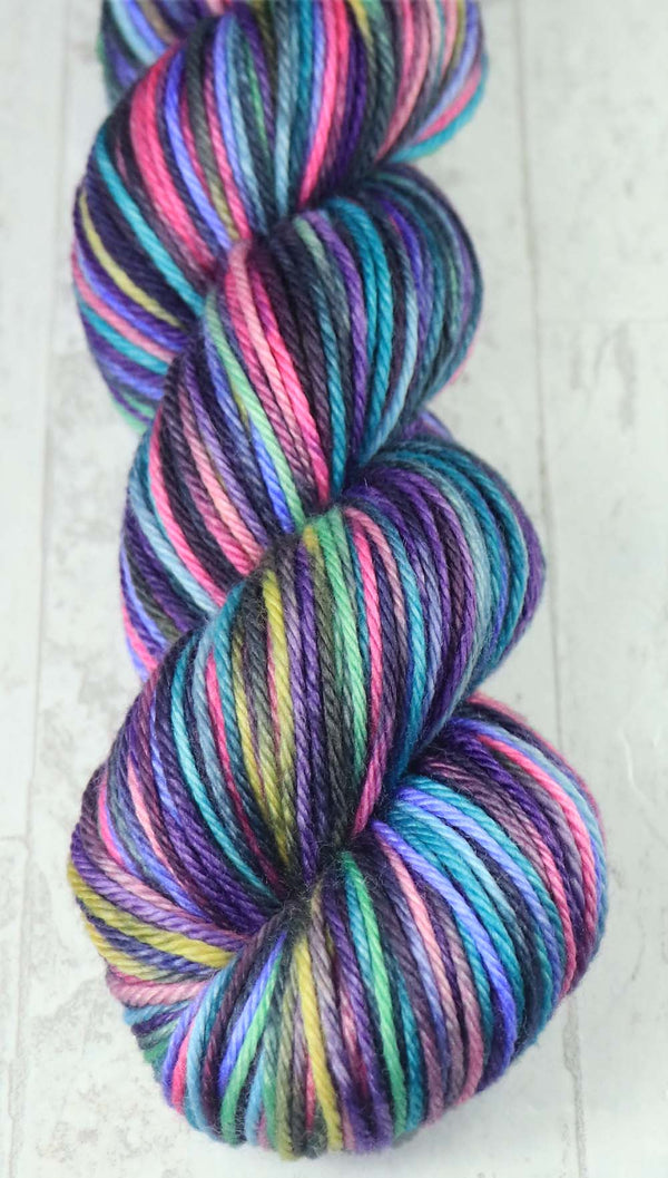ROSE WINDOWColor: Black, Purples, Pinks, Aqua, Green, Yellow100% Superwash Merino Wool218 yards / 100 gramshandwash in cool water, lay flat to dry In stock: 1 ~~ This colorway gets its namesake and inspiration from the stained glass window at St. Vitus...