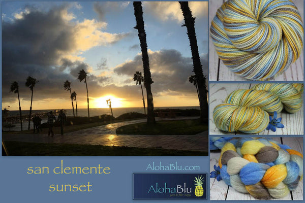 SAN CLEMENTE SUNSETColors: Blues, Yellows, Grays, White50% Rambouillet / 50% Silk wool top4ozhandwash In stock: 2 braids~~ When we visited our family members in the beautiful beach town of San Clemente around Thanksgiving, I snapped this photo of the sun setting...