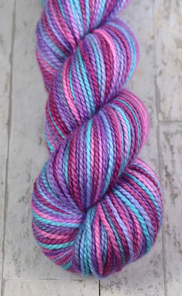 TEAPOT STILL LIFEColors: Magenta, Pink, Purple, Teal85% 19.5 micron merino wool, 15% mulberry silk215 yards / 100 grams / 2-ply worsted weight yarnhandwash in cool water, lay flat to dry In stock: 1 ~~ This colorway was inspired by an amazing artist/illustrator, Aaron Spurgeon. I...