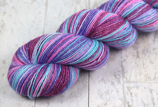 TEAPOT STILL LIFEColors: Magenta, Pink, Purple, Teal92% Superwash Merino wool, 8% Lurex (metallic sparkle) sock yarn: "LANIKAI" base400 yards / 100 gramshandwash in cool water, lay flat to dry In stock: 1 ~~ This colorway was inspired by an amazing artist/illustrator, Aaron Spurgeon....